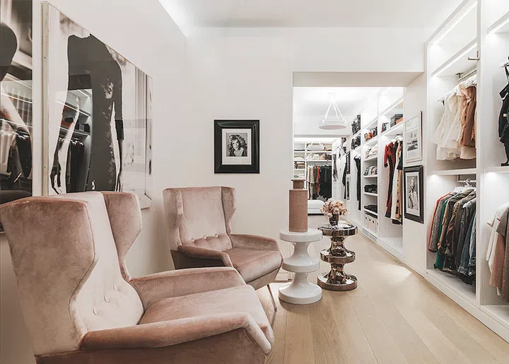 A neat and well-kept walk-in wardrobe presents Kelly’s flawless taste in clothes.
