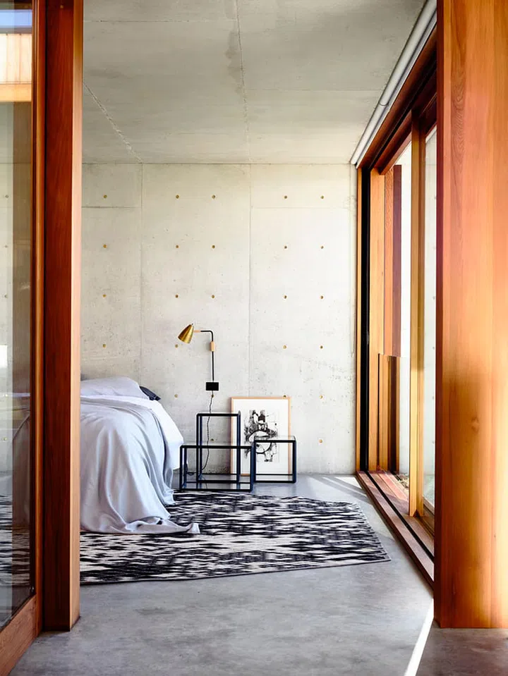 Despite the rawness from the concrete walls, the sunlit bedroom feels warm and cosy. The right linen and area rugs can help achieve this.