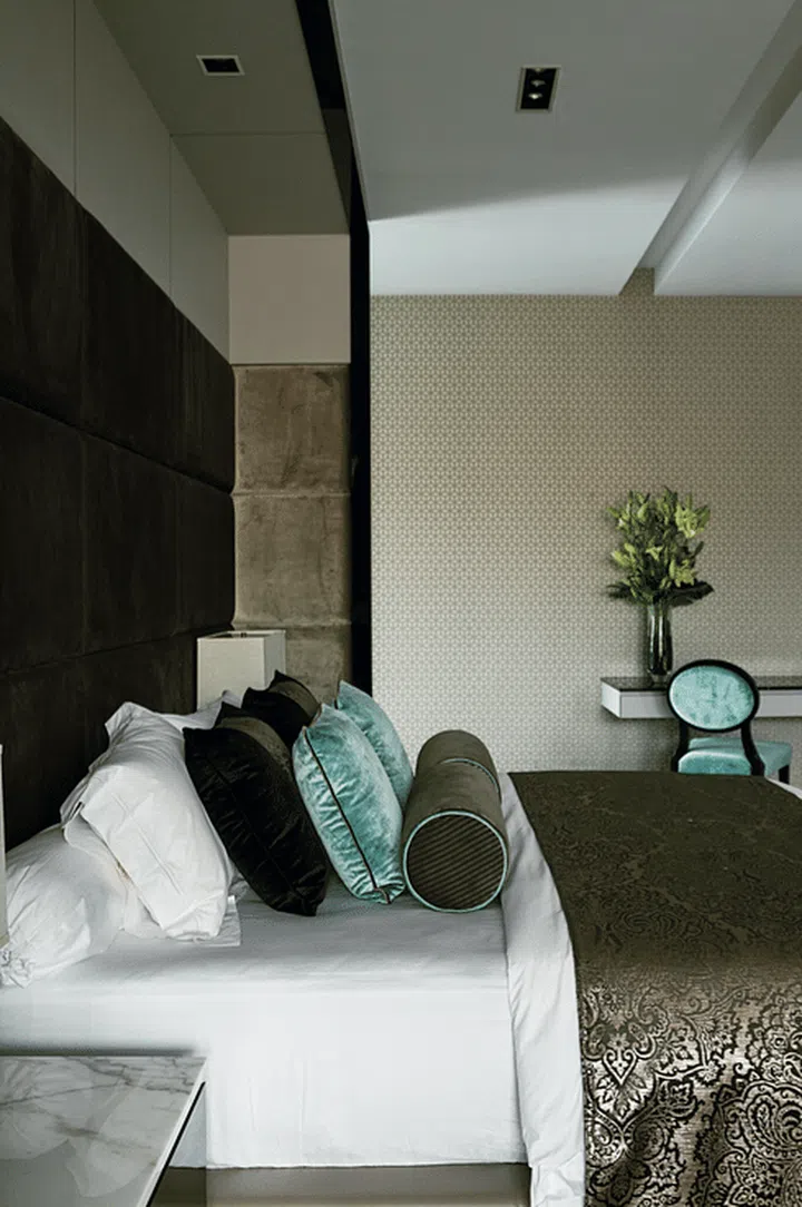 In the master suite on the second floor, the mood is elegant and sophisticated with mellowed neutrals and a hint of subtle colour. Opulent textures in the furniture upholstery, headboard panelling and bedding further add to the hotel suite look.