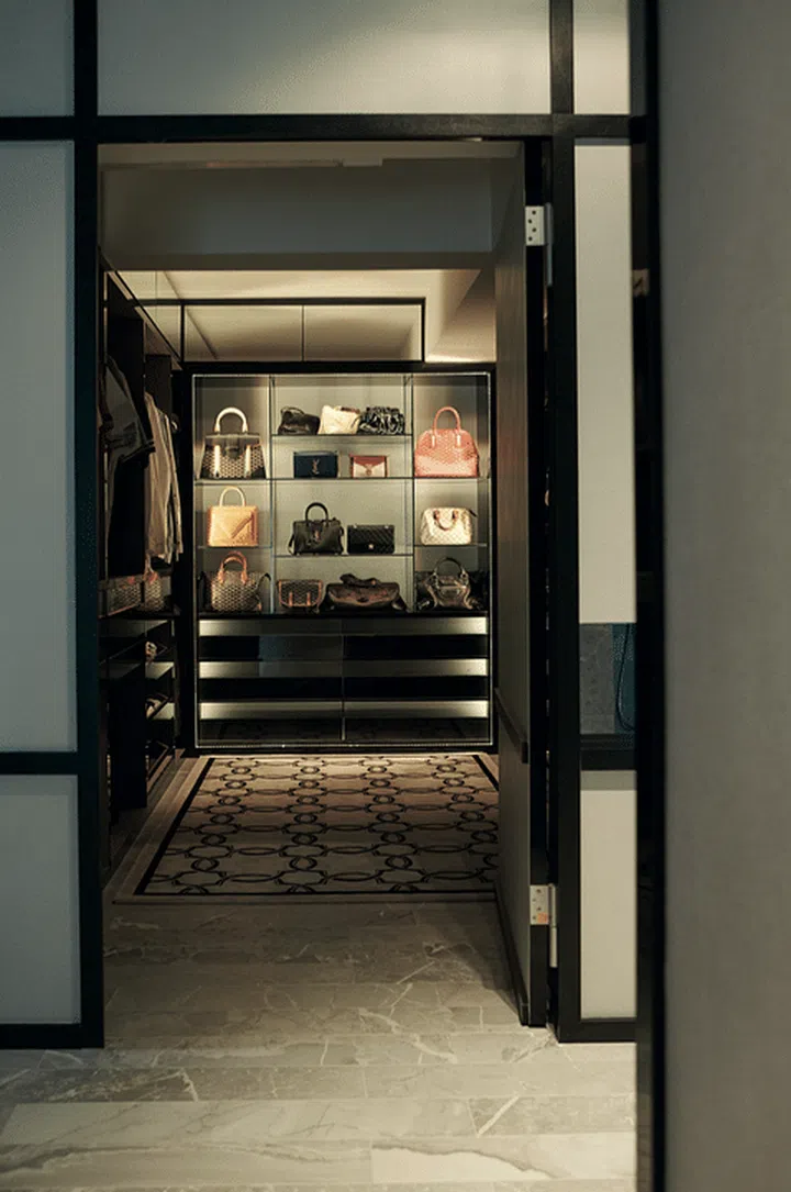 A concealed spacious walk-in wardrobe provides lots of storage space for bags and accessories, as well. Its design incorporates soft lighting and mirrored finishes, for an ambient dressing area.
