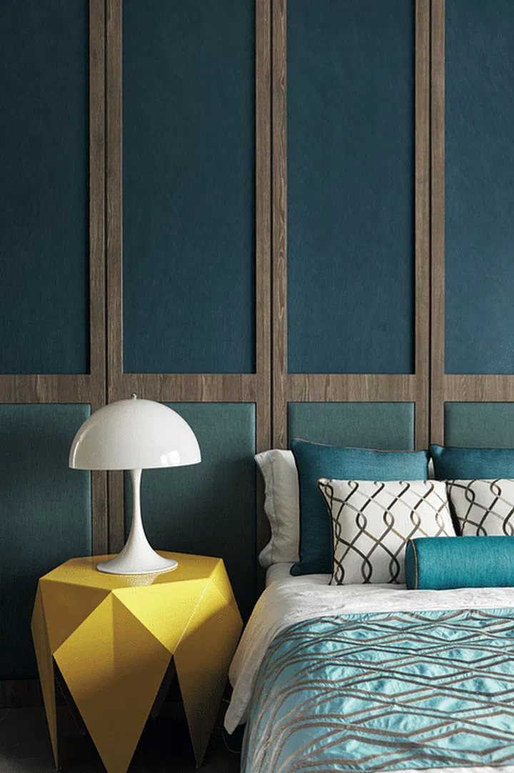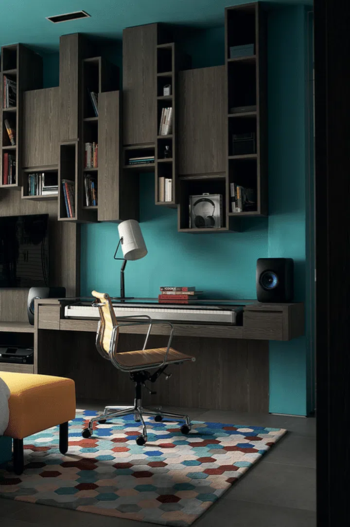 The bedroom of the younger son has a playful look, featuring a colour palette based on complementary teal and yellow colours.