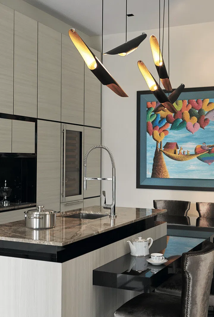 The design makes use of clean-cut linear forms and details, as seen in the dry kitchen built-in cabinetry that is done up in contrasting neutral shades of cream and beige, and stark black.