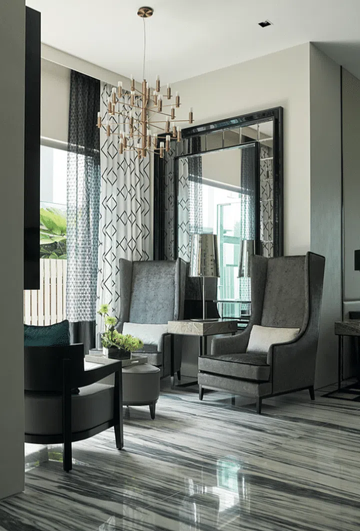 This capacious family home — a three-storey semi-detached house — is designed to have spaces unique to each individual, while still maintaining a unified look that is stately, elegant and absolutely alluring. The work took over a year and was overseen by Adrian Heng of Ottimo Spazi, and the result is a luxurious modern classic, hotel-inspired look.