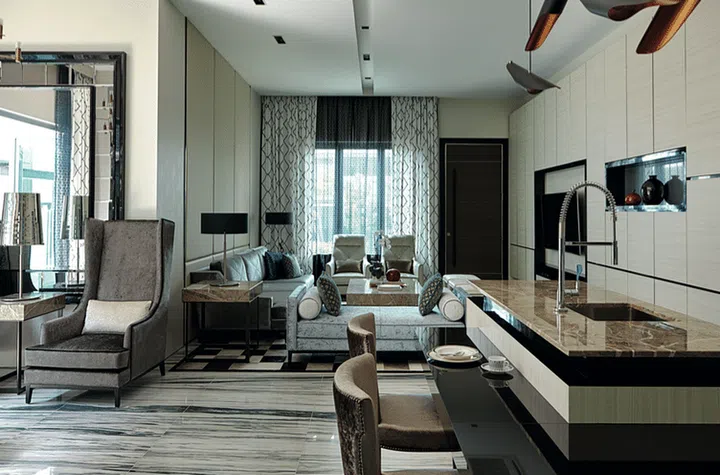 The living area is tastefully furnished with an assortment of bespoke furniture, for a comfortable and luxurious space to hold family gatherings.