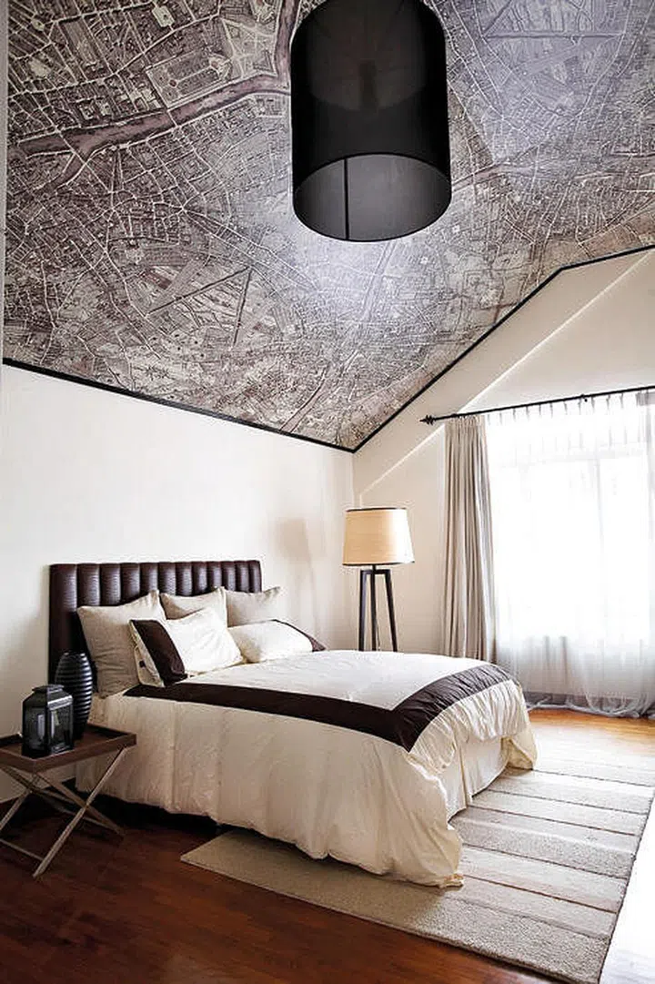 A map imported from Paris clads the ceiling to “disguise the awkward pitch of the roof”, say the designers. Low-key furniture pieces draw attention to the one-of-a-kind ceiling art.