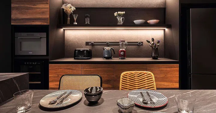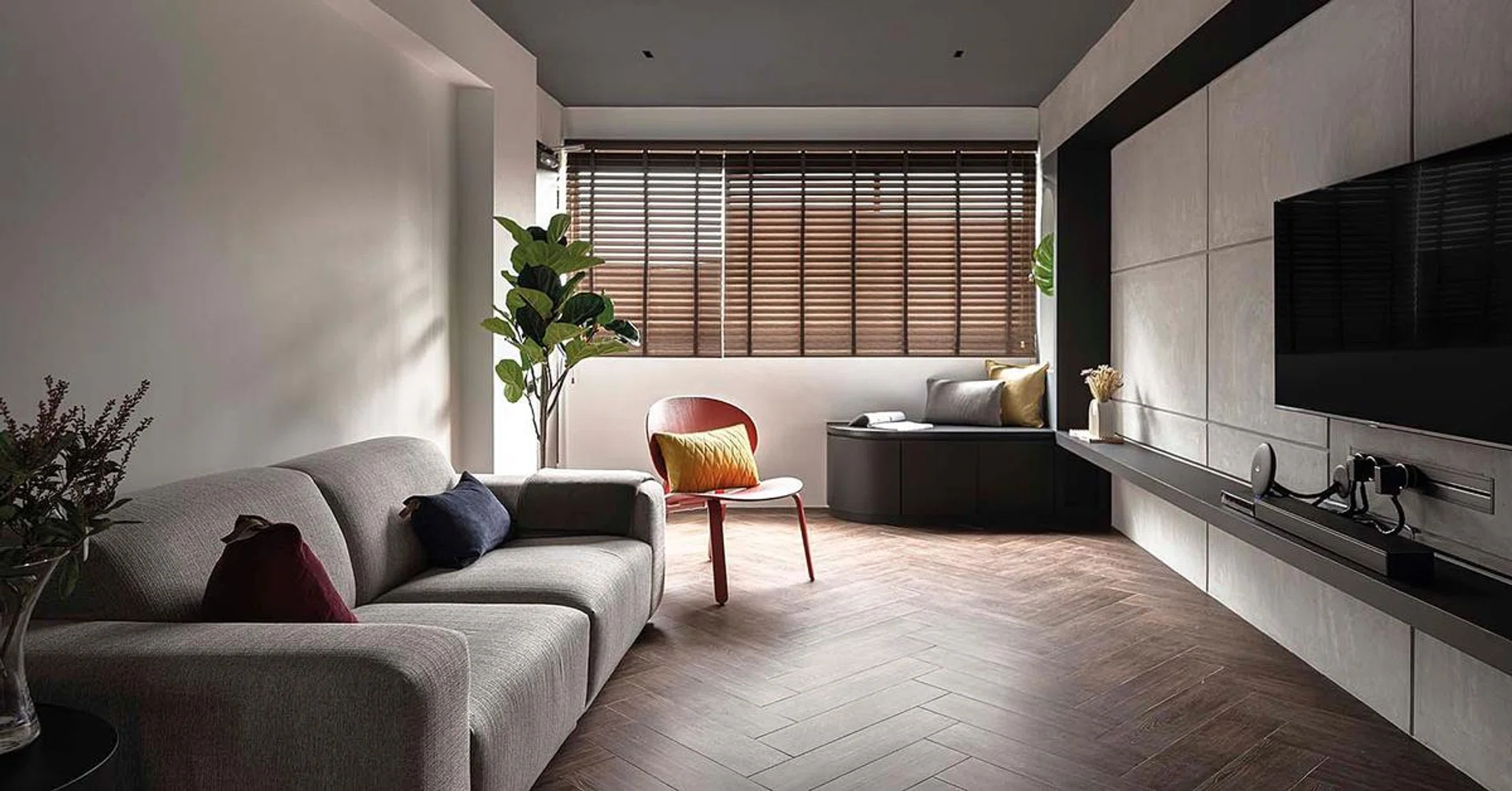 From the timber-look tiles laid in a herringbone pattern in the living room to the hexagonal tiles in the kitchen, the flooring finishes even reinforce the spatial fluidity and define each space in the absence of dividing walls.