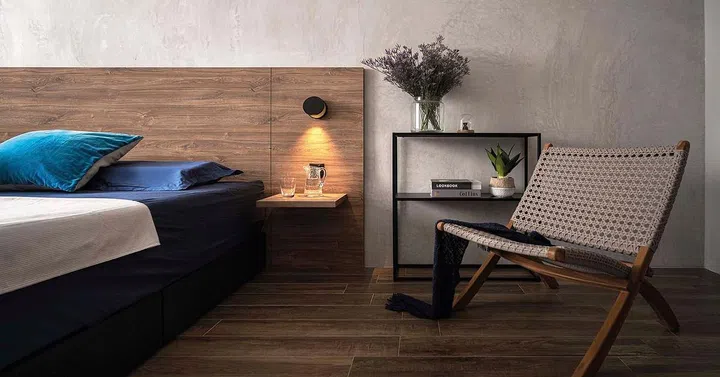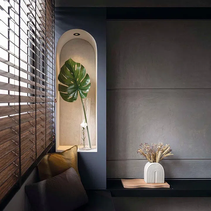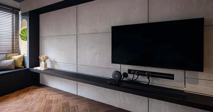 An existing wall separating the living room from the bedroom next to it was hacked and shifted to the bedroom to enlarge it. With its concrete slab look and shelves, the new feature wall has a great look.