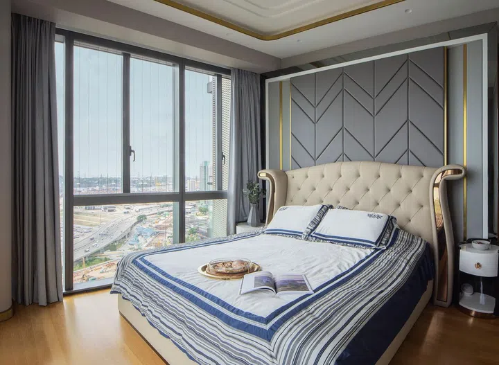 For the bedrooms, Distinctidentity took a more tactile approach. The headboard, for instance, is upholstered and tufted for a soft, cosy and sophisticated look. The feature wall, while a departure from the marble outside, ties in with the rest of the living spaces thanks to a grey and gold palette.