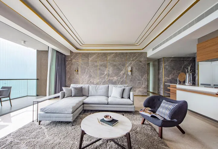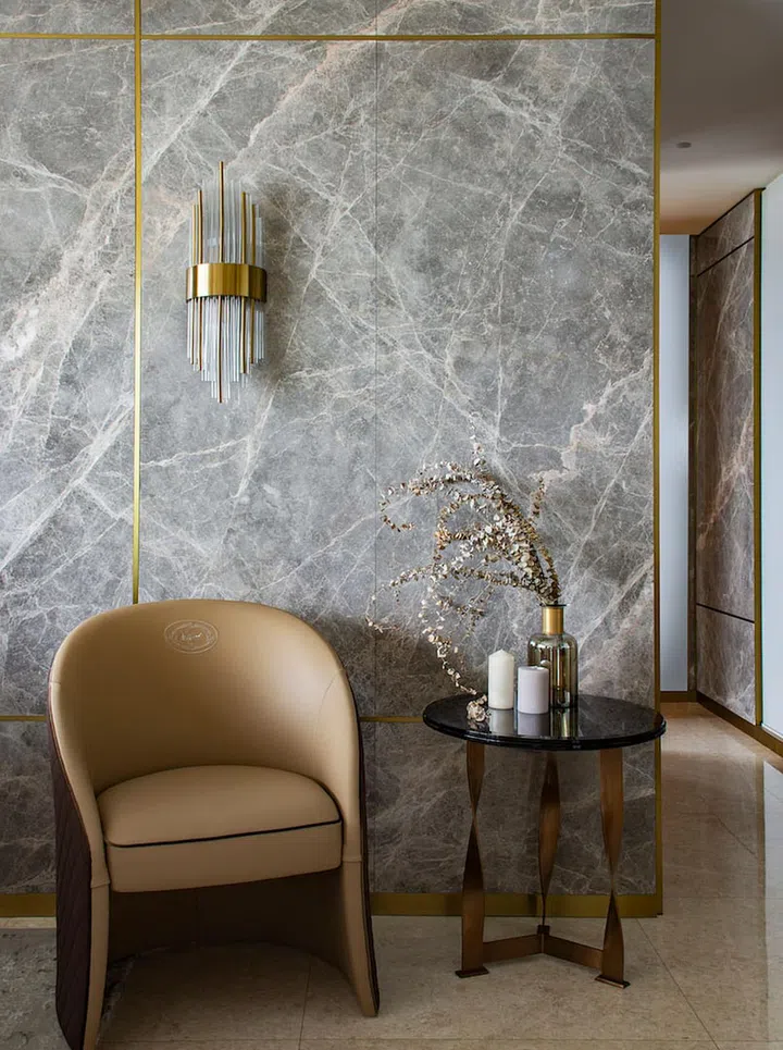 Grey marble walls with striking veining feature in the living room, as well as a tray ceiling edged in reflective metal strips that are also seen on the walls. Artfully placed LED and cove lighting further add to the sophistication of the room.