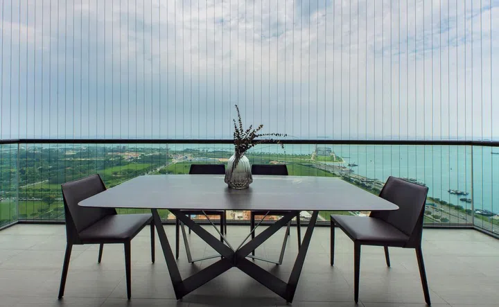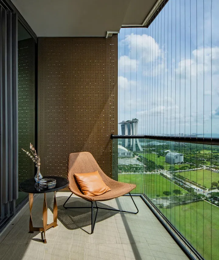 The furnishings in the balcony are understated and elegant, complementing the aesthetic of the interiors.