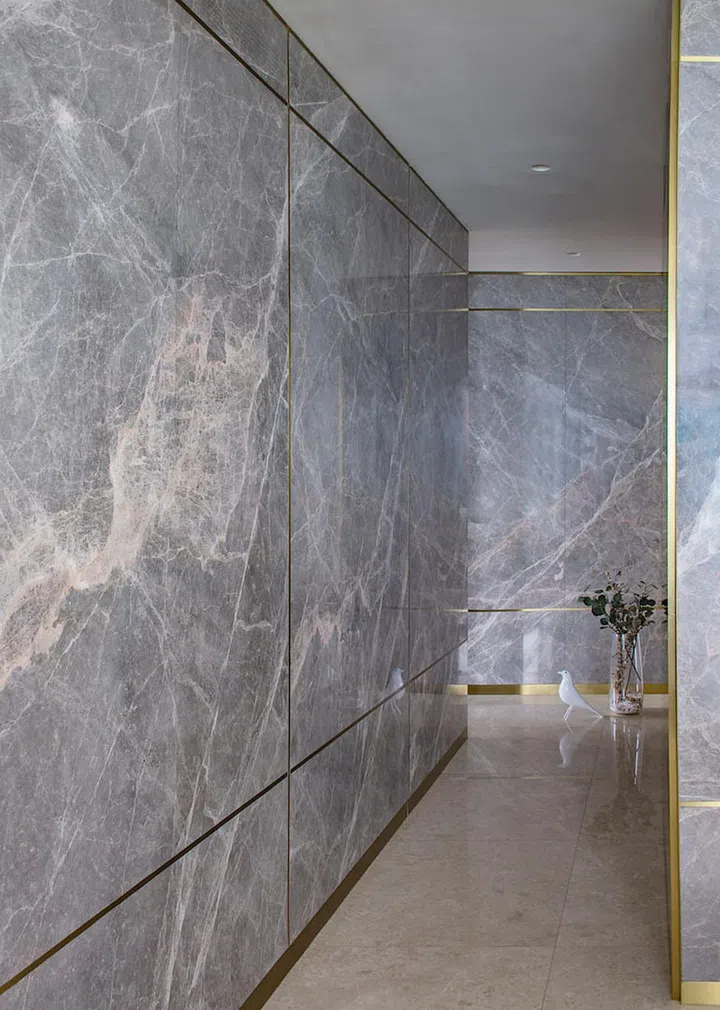 Marble-clad walls of the hallway hint at the interiors of the apartment's living spaces.