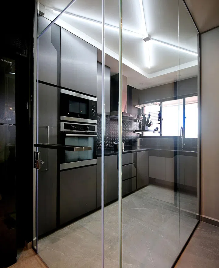 With its full-glass enclosure, the kitchen retains a pseudo “open-concept” look that is presently all the rage, yet prevents the cooking fumes from spewing into the rest of the home.