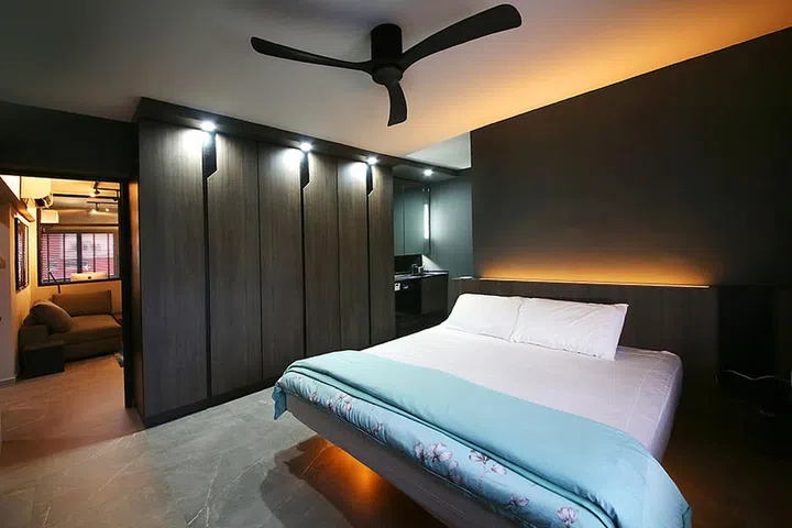 In the master bedroom, Kelvin customised a floating bed design for a minimalist look; it even comes with a bedhead that serves as a hidden compartment for power sockets and cables.