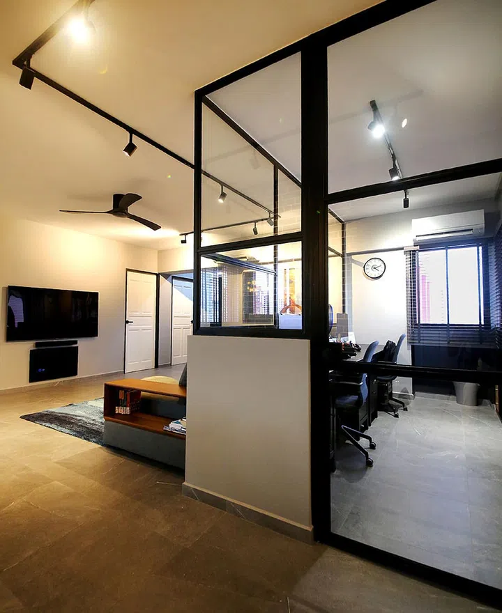 Carved from the back of the living room, the study was given a half-wall with glass windows to allow lots of natural light to penetrate.