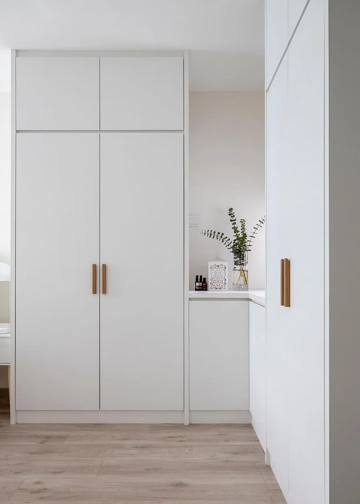 Wood-look detailing in the cabinet handles and flooring warm up the overall aesthetic in the bedroom.