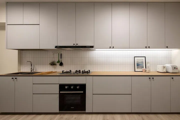 The fully-equipped kitchen sports a clean and seamless look – white, vertically-oriented subway tiles mimic the kitchen cabinets. The countertop surface is from EDL.