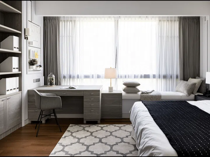 The bedrooms of the two daughters, who are young adults, are designed with an elegant style coupled with a hint of youthfulness. The bay windows were converted into comfortable seating, providing a space for the mother to catch up with her daughters individually.