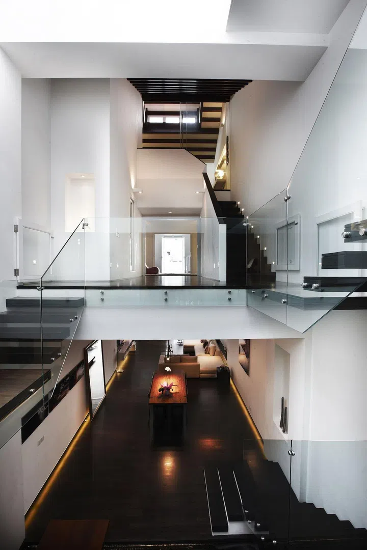 It received an instant stamp of approval from the owners. “I love the fact that when you enter, you can see straight through the back, but know that the various areas are designed for specific purposes,” says the owner. To recreate the shop house essence, we redefined two characteristic features of shop house architecture – the skylight and the air well. To emphasise the importance of this space as the fulcrum of the house, we introduced a water feature and koi pond and made the staircase wind around this water feature.
