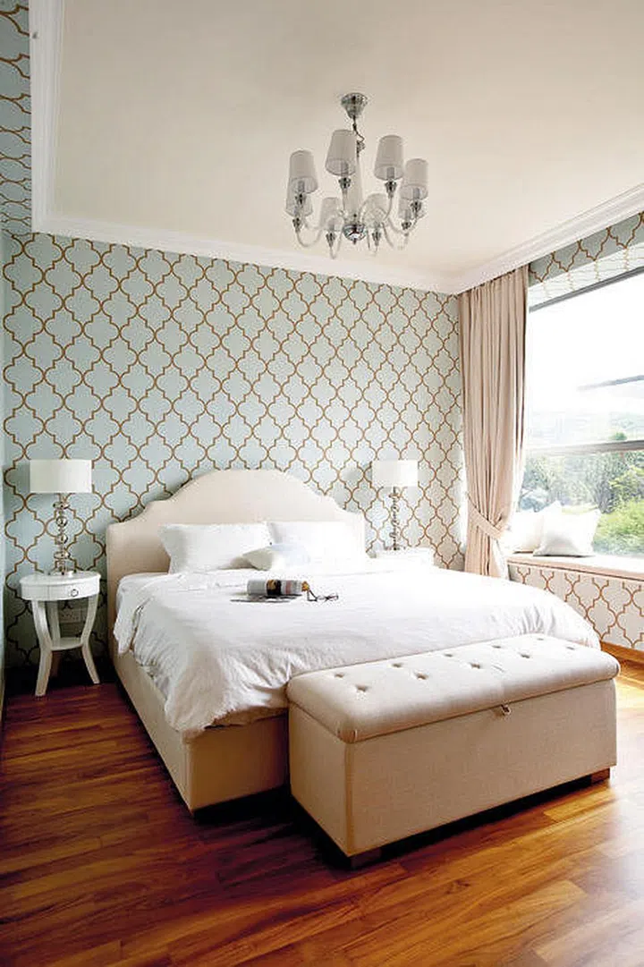 The master bedroom is a plush, cosy cocoon wrapped in duck egg blue wallpaper.