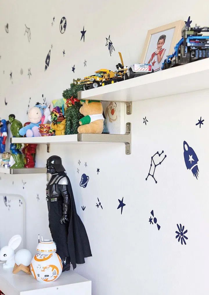 The bedrooms flank the social spaces – one wing for the parents and the other for the boys and guests. The boys’ bedroom provides space for their current obsessions – shelves for action figures, blank wall for decals and illustrations – while still holding rooms for further development, allowing them to change the elements as their interest evolves.