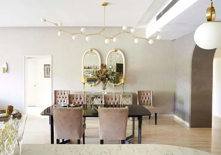Stepping into this family home feels like arriving at a bona fide hospitality establishment. It has a grand entrance. Guests are welcomed into a sizeable foyer decorated with a round mirror with a marble shelf.