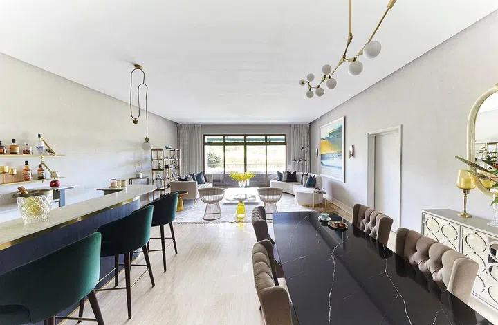 Anchoring the home is a seamless living-dining area. Positioned right after the foyer, the aforementioned bar is well stocked with whiskey and gin, all displayed on custom brass and floating glass shelves embedded