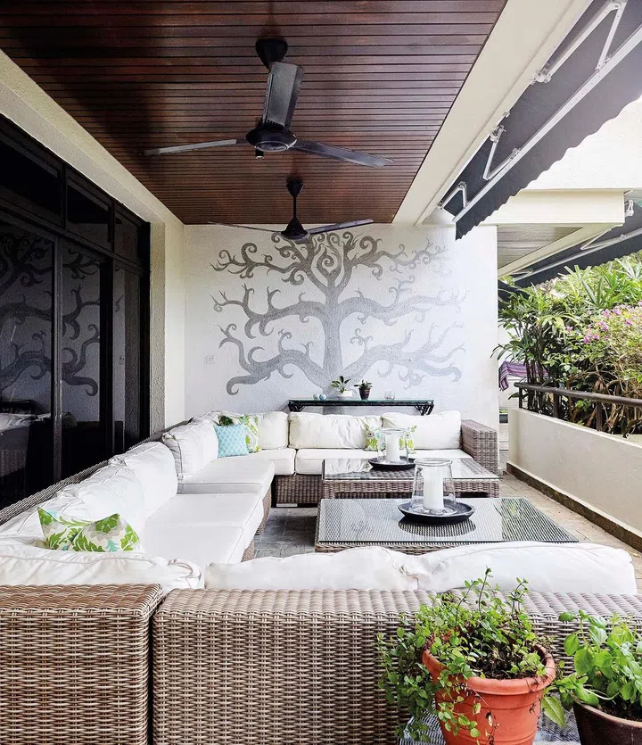 It opens up to the balcony, where a trickling fountain breathes freshness into the indoors.