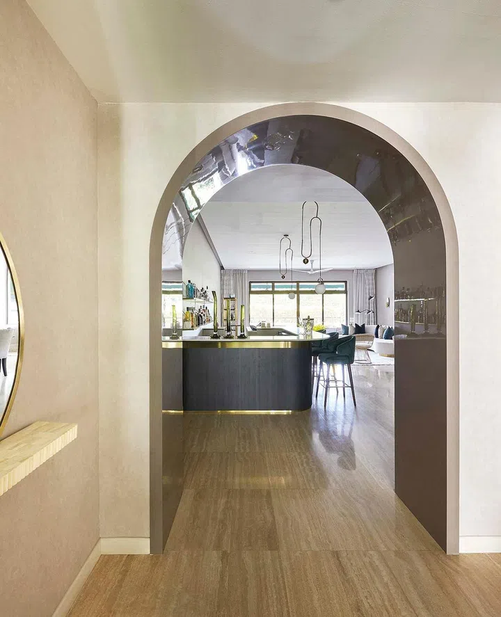 Through the glossy archway is a curvy bar with dark laminate and brass finish, and beyond it is an elegantly decorated living space with a lush view of the greenery outside.