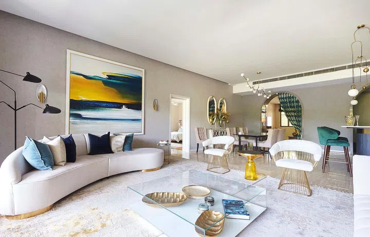 Brass accents, mirrored finish, and a myriad of textures – cement-texture wallpaper, abstract carpets from Nasser Nishaburi, to name a few – tie these elements together, creating a richly layered look while keeping it elegant.