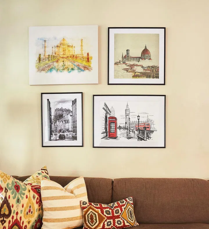 Meanwhile, the guest bedroom draws its colour palette from a pair of artworks depicting sunrise and sunset in Santorini.