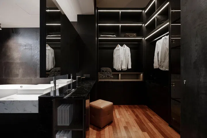 The dark palette of the wardrobe contrasts with the sleek white countertop of the washbasin area, once again bringing in the gradient approach that was used on the floor below.