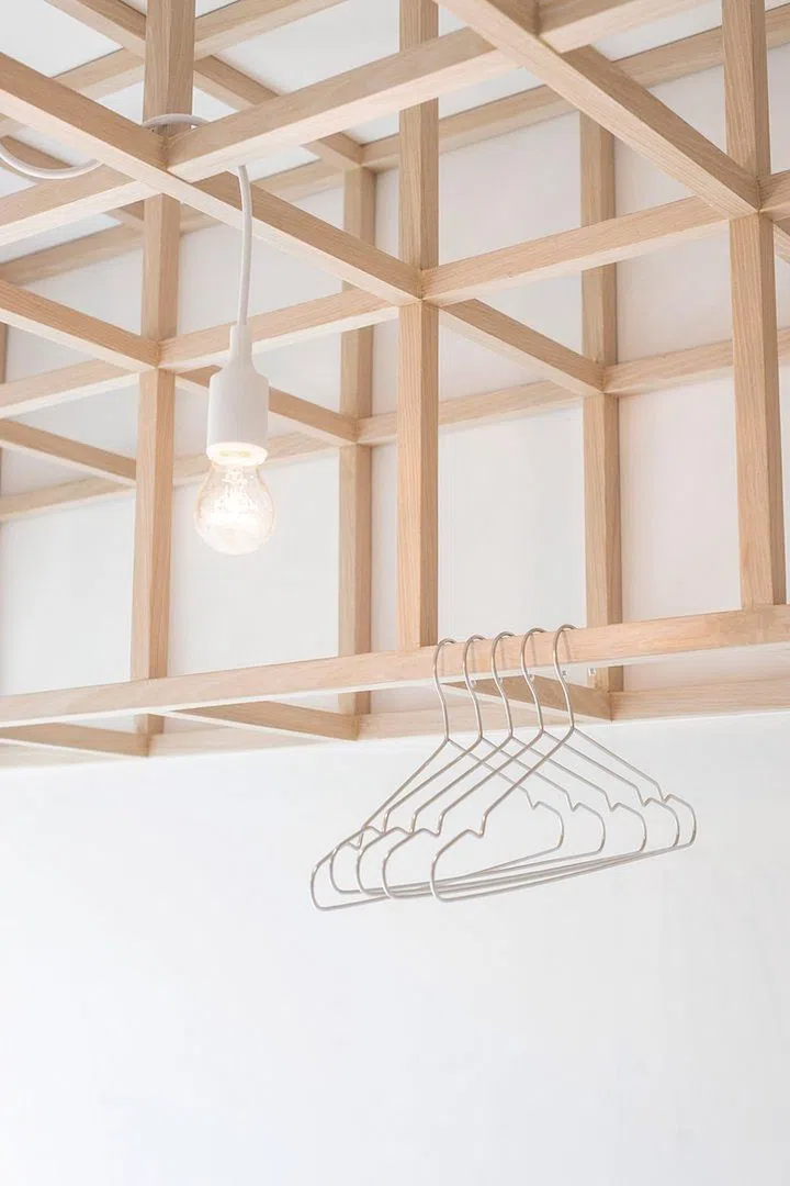 In the guest room, the bed is built around a series of hollow wooden boxes. The boxes transform into shelving space as well as a place for hanging clothes in the room.