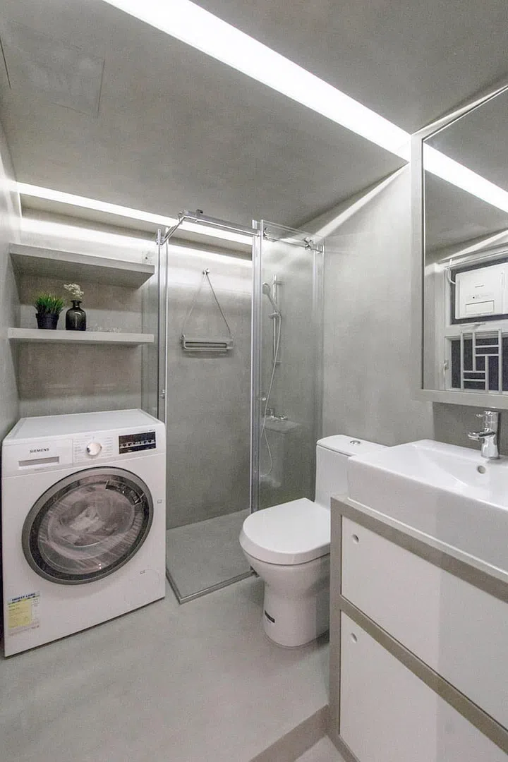 In one corner of the bathroom, one finds the washing machine lined up next to the shower area.