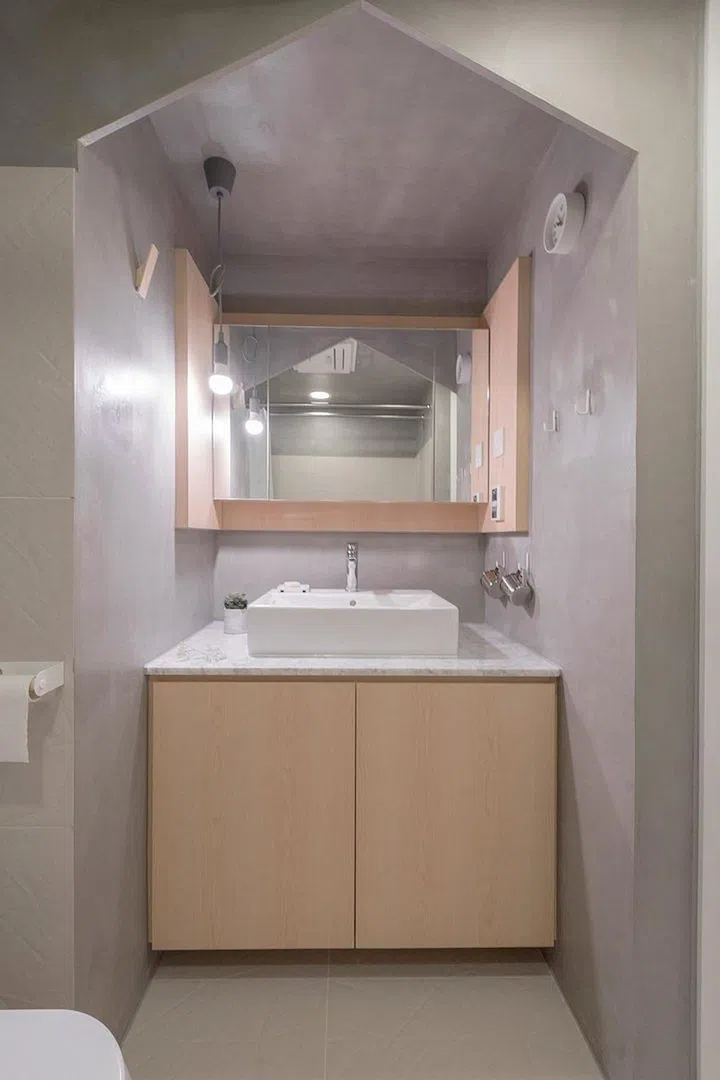 In the bathroom, the sink area is separated from the rest of the bathroom with an entryway in a gable-shaped opening.