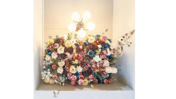 The flowers don't end there. Look up at the ceiling near the foyer and a floral sculpture called Ode to Mother looms above you, thanks to her fascination with shopfront floral displays in London.