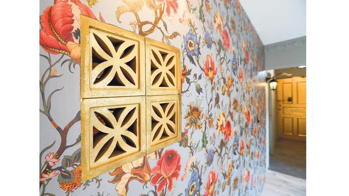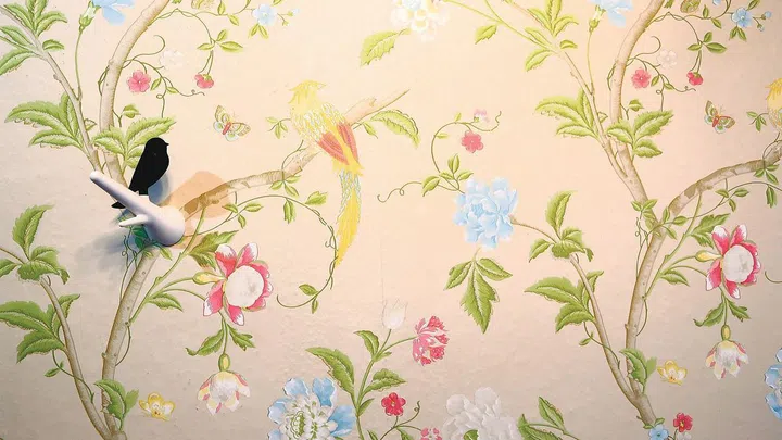 Ms Tan opted for Laura Ashley on one wall, in its classic design featuring flowers and birds against a beige background.