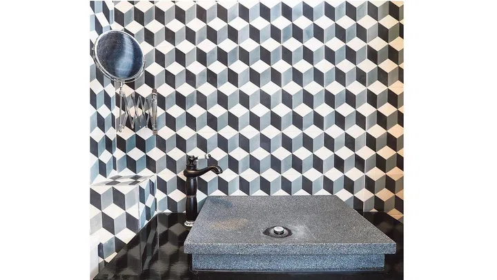 The bathroom walls have Escher-pattern tiles, which she says are a nod to her graphic design roots, as he was the first artist she studied as an art student. There is also a 30kg stone sink that sits on a customised steel table.
