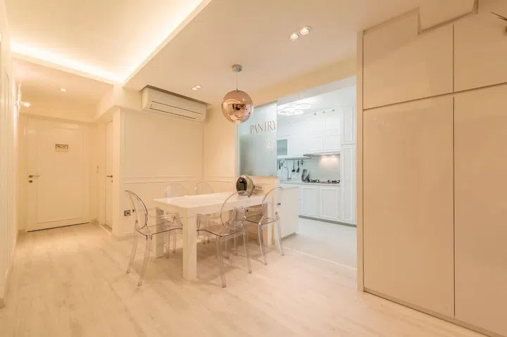 The home has a mainly cream white palette with wainscot panelling on the walls for a refined look. The dining area is made modern with the Louis Ghost dining chairs and brass pendant lamp.