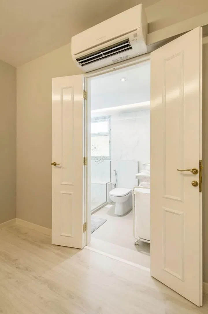 The designer installed double doors for the entrance of the master bathroom that were spray painted the same cream shade as the living area.