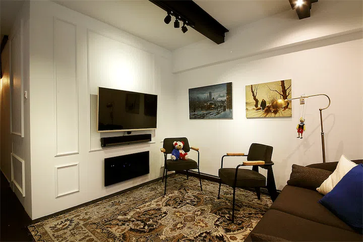 The wainscoting continues into the living room, behind which is a hidden compartment for devices and wiring.