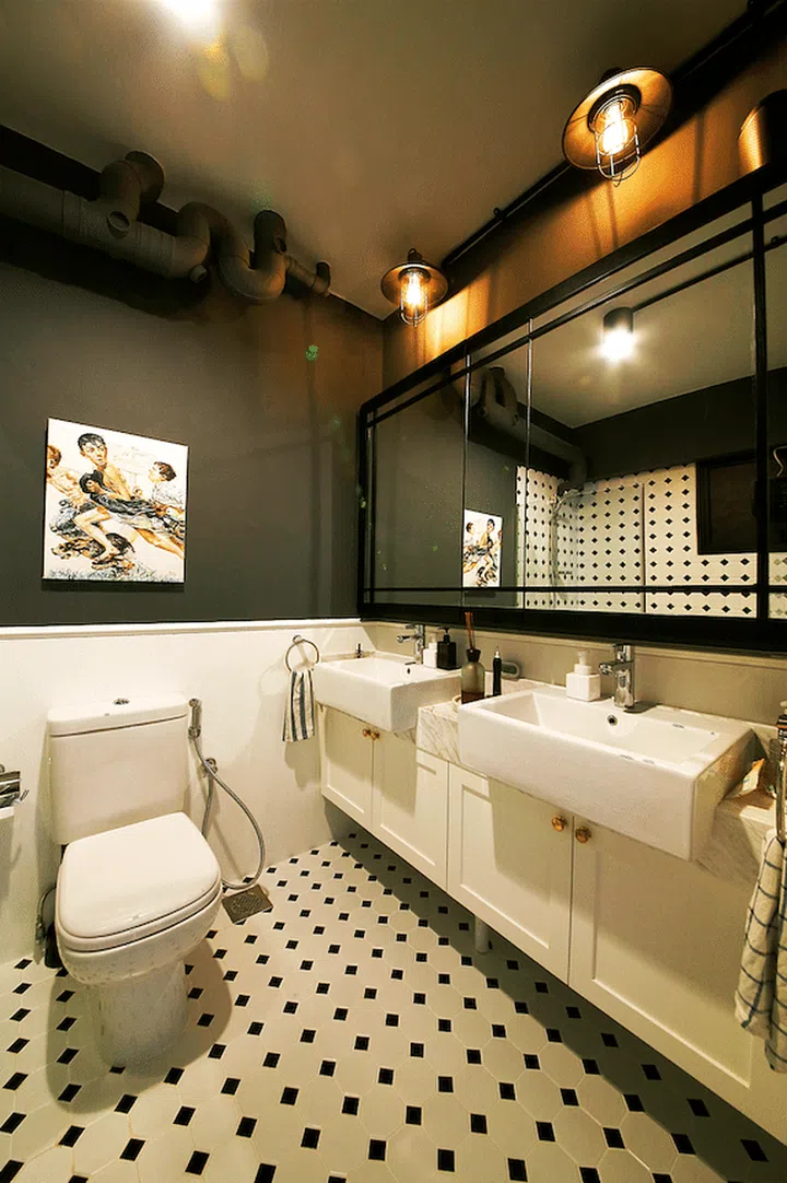 The bathrooms, too, are mostly in black and white shades, with patterned tiles on the floor and walls. Kelvin painted the exposed pipes according to the respective wall colours to camouflage them.