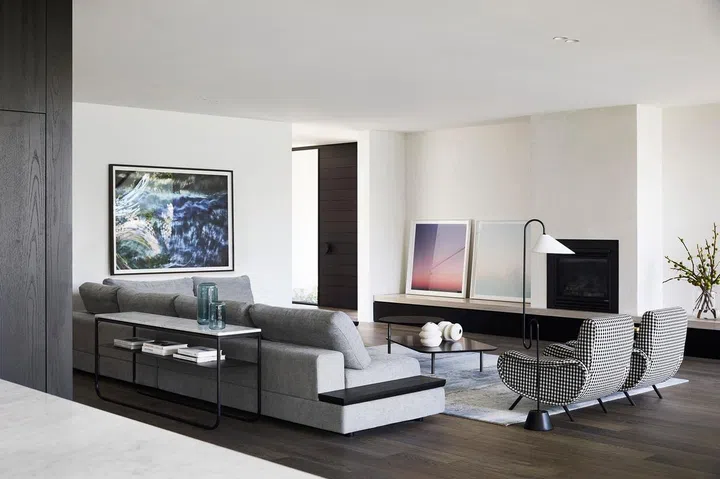 The interiors reflect a sense of calm. Dark wood floors anchor the space with a grounding energy, while soft grey furnishings in tactile fabrics like bouclé and brushed cotton create layers of comfort that invite lingering conversations.