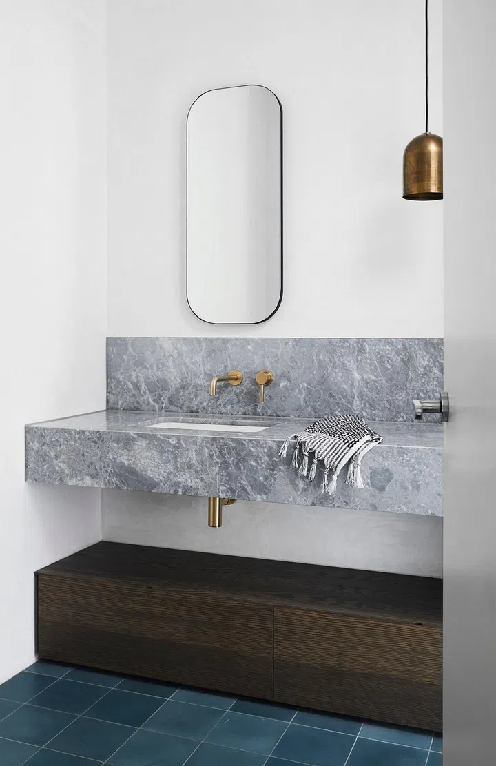 Natural materials, such as the marble for the bathroom counter and the wooden cabinets and floor, establish a connection between indoors and out that makes the threshold between garden and home feel permeable and fluid.