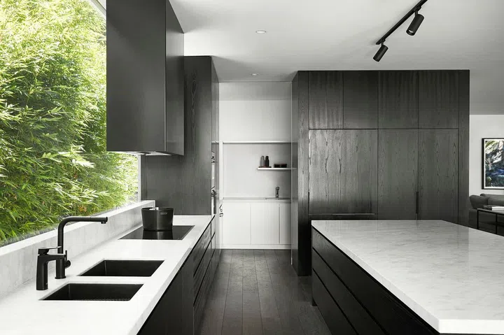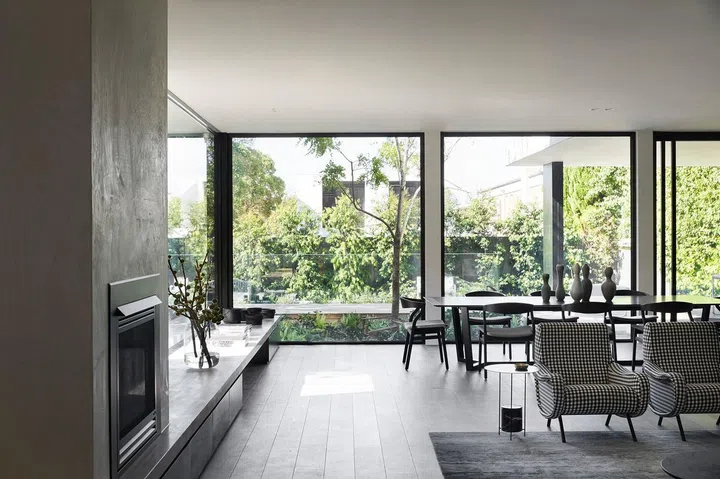 The tall, leafy tree you see here – a blossom tree planted by the homeowners a decade earlier when they first purchased the property – has become more than just a garden feature; it’s the poetic heart of their family story. This quiet sentinel, with its seasonal transformations marking the passage of their years together, served as the primary inspiration to design firm Studio Tate when the couple decided it was time to reimagine their living space.
