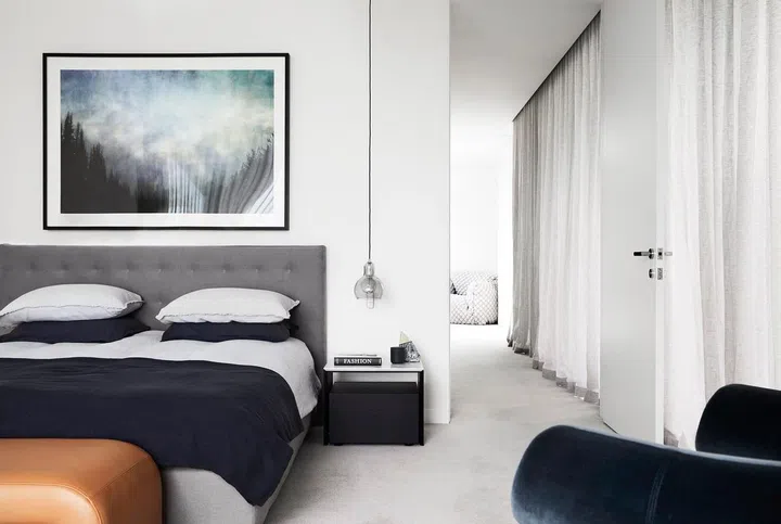 A fabric headboard in grey, pendant lamp made of glass, and sheer day curtains that filter light without blocking it entirely create a soft and restful bedroom that the couple describes as their “decompression chamber.”