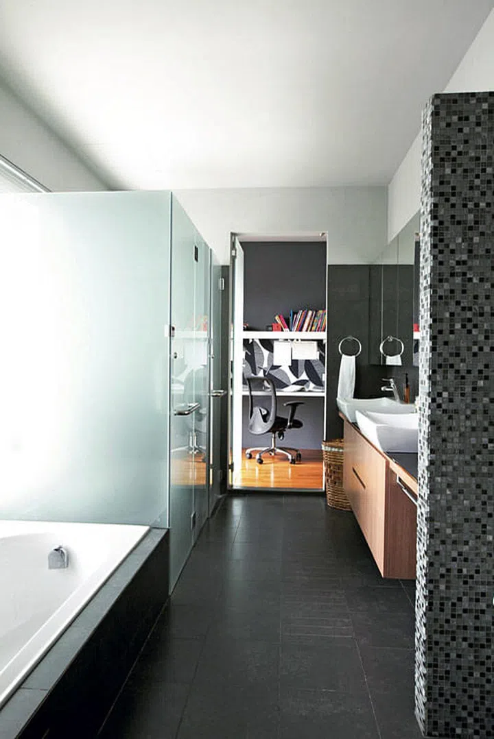 Shades of grey in the study and bathroom link the spaces visually and also add a touch of sophistication.