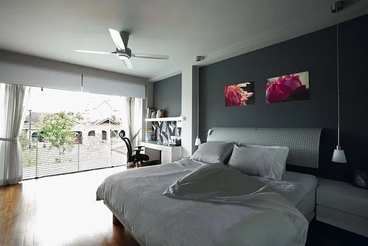 This intermediate terrace house in Serangoon Gardens has a light colour palette and lots of windows and glass walls to brighten up the interior spaces. The effortlessly chic living room is furnished with a good mix of designer pieces like the Eames chairs and afforable finds like the Ikea chandeliers.