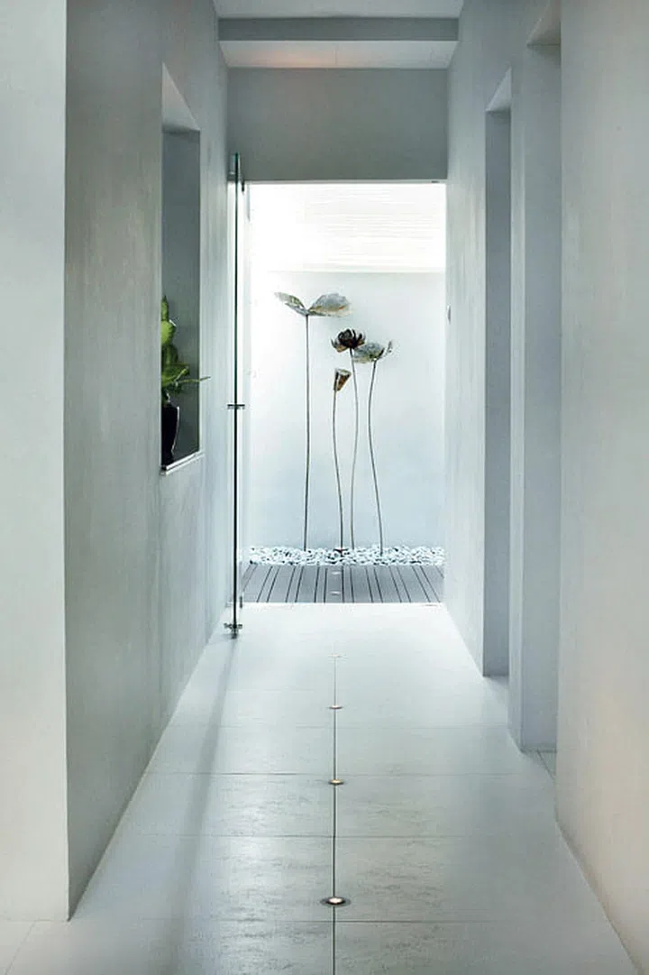 To visually connect the front door to the rear, the designer of this home, Vincent Goh of TG Alliance, embedded LED lights in the floor. The line of lights leads to an arrangement of bronze lotuses in the back porch.