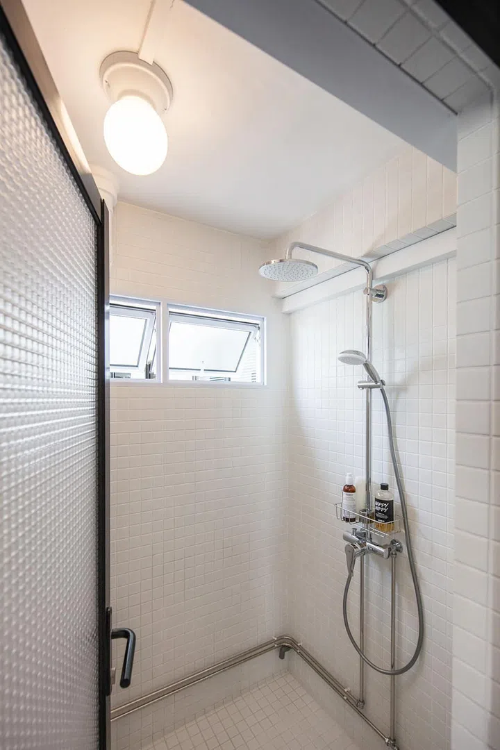 Christian adopted a minimalist approach when designing the bathroom and toilet due to their small sizes. The white tiles with white grout are a cleaning nightmare, but they make the spaces appear larger than they actually are.
