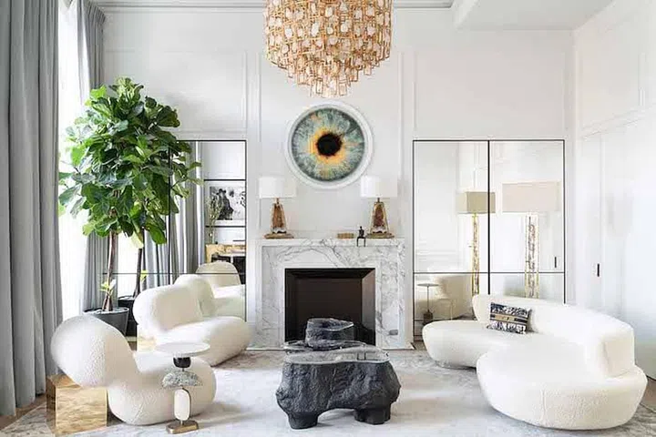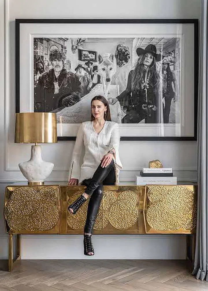 For the bedroom, British artist Bianca Smith also painted a portrait of the client called “Josephine Dancing in Heels with Fans and a Glass of Champagne. Mark Quinn's spectacular round work for the living room was bought from a private collector.